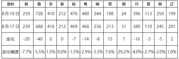 截至8月17日,重點監測省份生產企業庫存總量為3906萬重量箱,較上周四庫存下降83萬重量箱,降幅2.08%,庫存環比降幅縮小7.71個百分點,庫存天數約19.11天,較上周減少0.40天(注:本期庫存天數以截至本周四樣本企業在產日熔量核算)。本周重點監測省份產量1311.00萬重量箱,消費量1394.00萬重量箱,產銷率106.33%。
